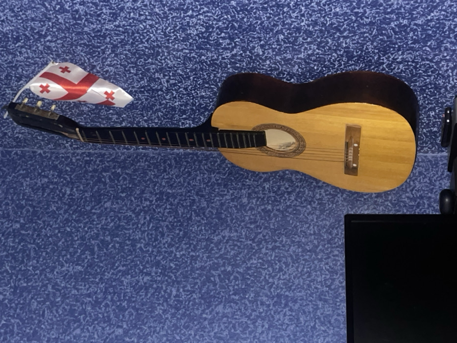 The image displays an indoor scene featuring a classical or acoustic guitar hanging vertically against a textured blue wall. The guitar has a light brown wooden front (soundboard) with a circular soundhole and a dark brown body (sides and back). A small, white Georgian flag with a large red St. George's cross and four smaller Bolnisi crosses is attached to the guitar's black headstock. In the lower-left foreground, the upper-left portion of a black computer monitor or television screen is visible, positioned on a dark surface which likely serves as a desk or shelf. Other dark, indeterminate objects are partially visible on this surface below the monitor. The wall features a mottled pattern of various shades of blue. The specific location within the city of Tbilisi, Georgia, cannot be determined from the visual evidence presented. No individuals are present, and no actions or interactions are depicted.