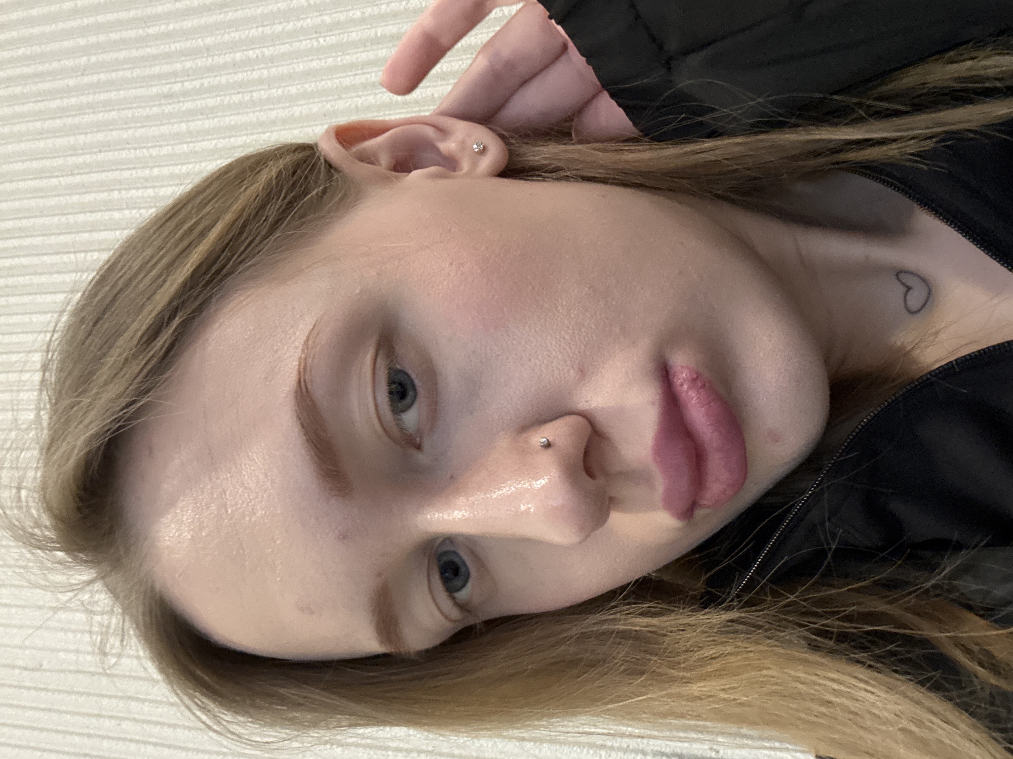 A close-up selfie shows a young woman with light skin, light brown hair, and blue eyes