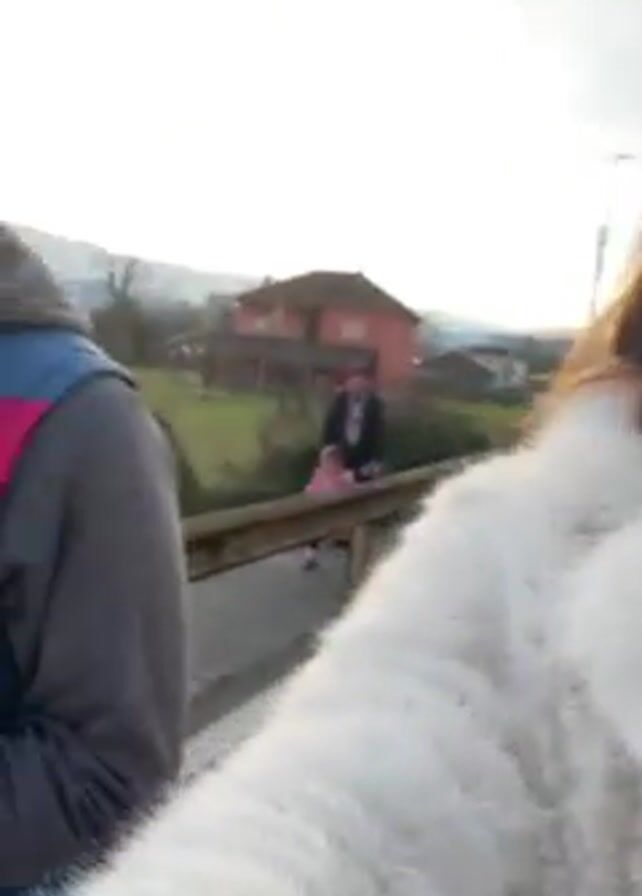 woman in a white faux fur coat filming a selfie-style video while walking outside. The camera moves to show two men standing nearby. One man is looking at his phone and is wearing a grey hoodie with a blue, pink, and purple vest. The other man has a long beard and is wearing a dark coat. The woman smiles at the camera. The background includes trees, a house, and a cloudy sky.
