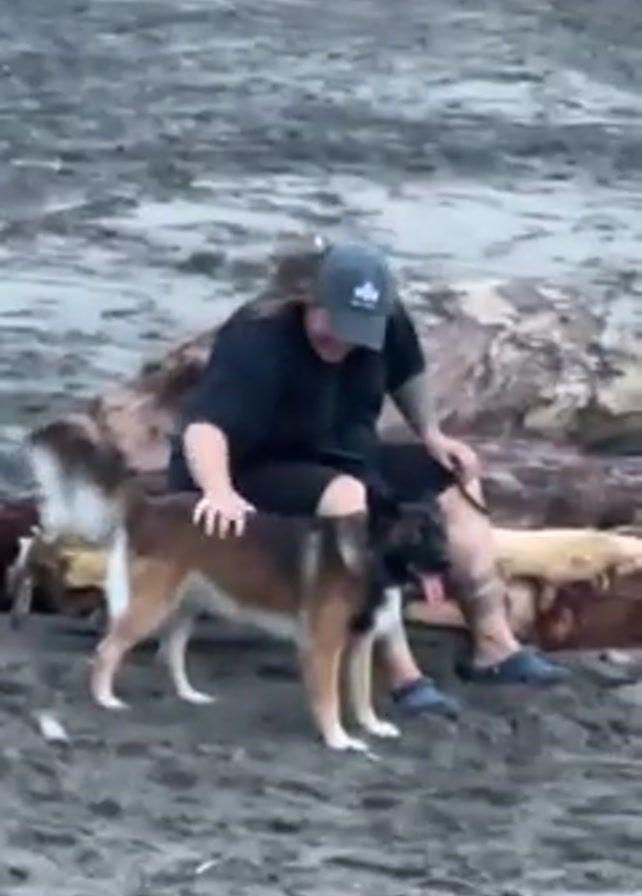 A woman wearing a dark shirt, a cap, and blue shoes is sitting on a piece of driftwood on a sandy beach. She is petting a brown and white dog standing in front of her. Other driftwood pieces are scattered around, and a few people are visible in the background.