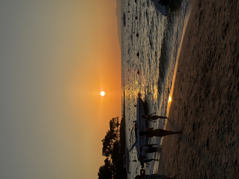 An outdoor, eye-level photograph depicts a sunset scene on a beach in Pattaya City, Thailand