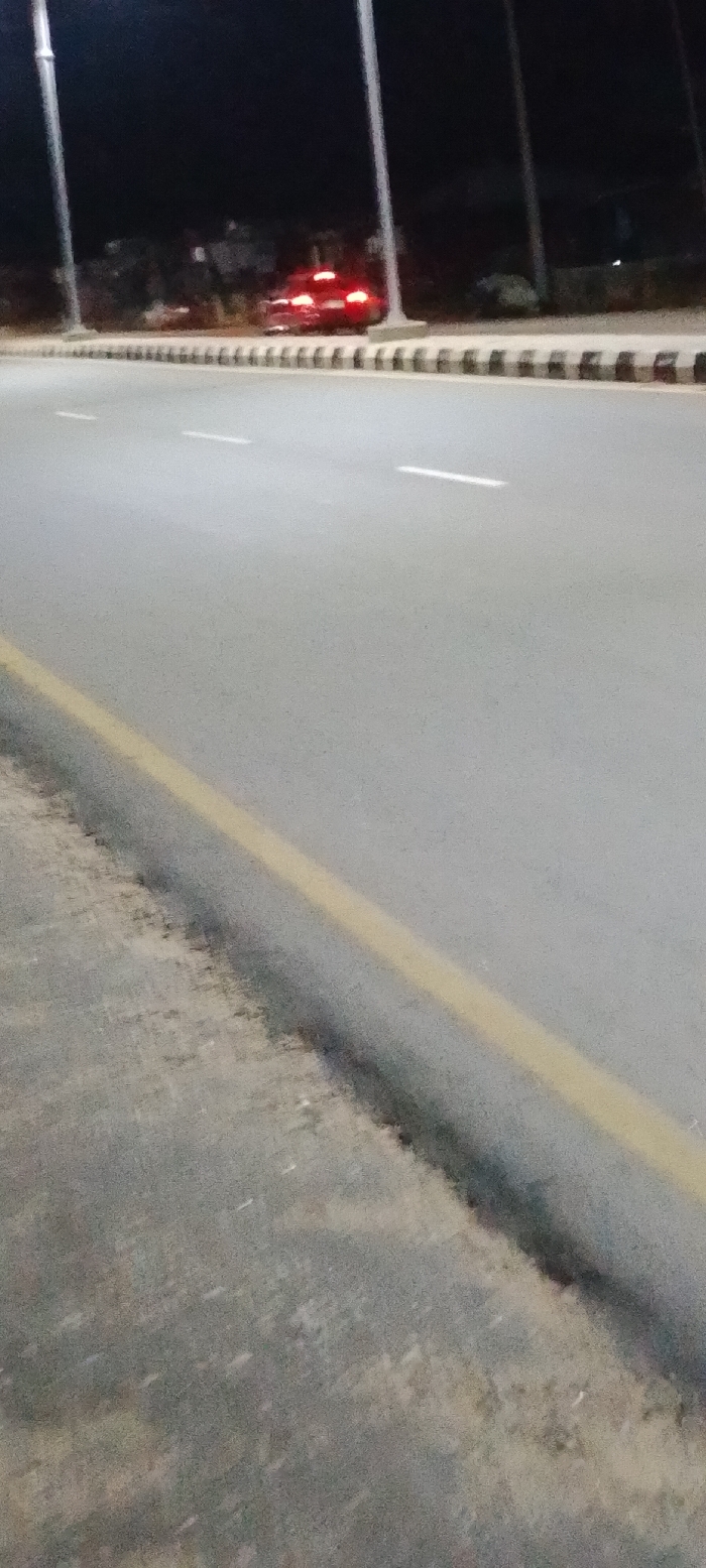 This forensic description details a nighttime scene on a paved road in Zango-ndaji, Nigeria. The foreground features a dark gray asphalt road surface with a solid yellow line delineating its left edge, adjacent to a rough, lighter gray dirt shoulder. White dashed lane markings are visible further along the asphalt. To the right, a raised concrete curb or median with alternating black and white striped markings runs parallel to the road. Beyond this median, two tall, light-colored streetlights are prominently positioned. In the distant background, a vehicle with illuminated red taillights is observable, suggesting it is either parked or in motion. The area beyond the vehicle and streetlights is dark, containing indistinct, shadowy forms that suggest buildings or dense vegetation. No individuals or discernable actions are visible within the frame.