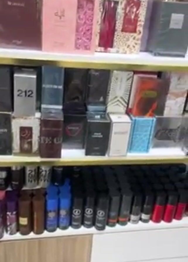 The camera pans upwards to show a variety of perfumes and deodorants displayed on shelves