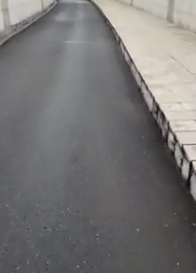 A person rides a bicycle through a tunnel. The walls of the tunnel are made of gray stone, and the road is black asphalt. The sky is overcast. The bicycle has a white wire basket.