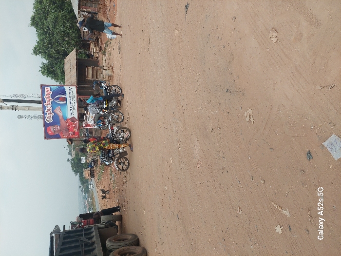 The image depicts an unpaved road junction in Awkuzu, Nigeria, under an overcast sky