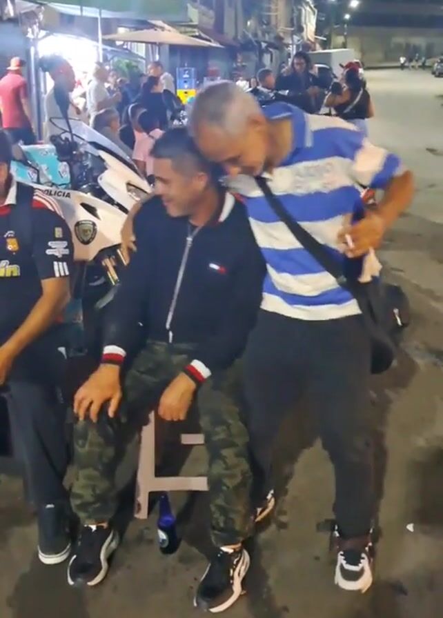 The video depicts a casual, nighttime street scene with a group of men gathered together. One man is seated on a small white stool, wearing a dark jacket and camouflage pants. A man in a blue and white striped shirt stands beside him, carrying a black bag slung across his shoulder and holding what appears to be a small bottle. Another man stands to the seated man's left, dressed in a dark shirt with a team logo on it. A police motorcycle is visible in the background, with other people milling around and some storefronts lit up. The overall setting suggests a social gathering in a public space, with a relaxed and informal atmosphere.