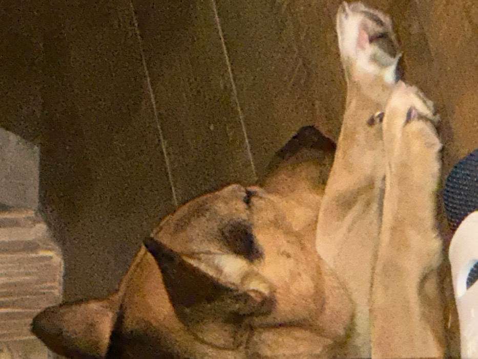 - "The image displays a tan and dark brown canid, consistent with a German Shepherd or similar breed, lying on a dark brown floor with subtle horizontal plank lines" by FM-2t2Dl2, licensed under CC BY 4.0