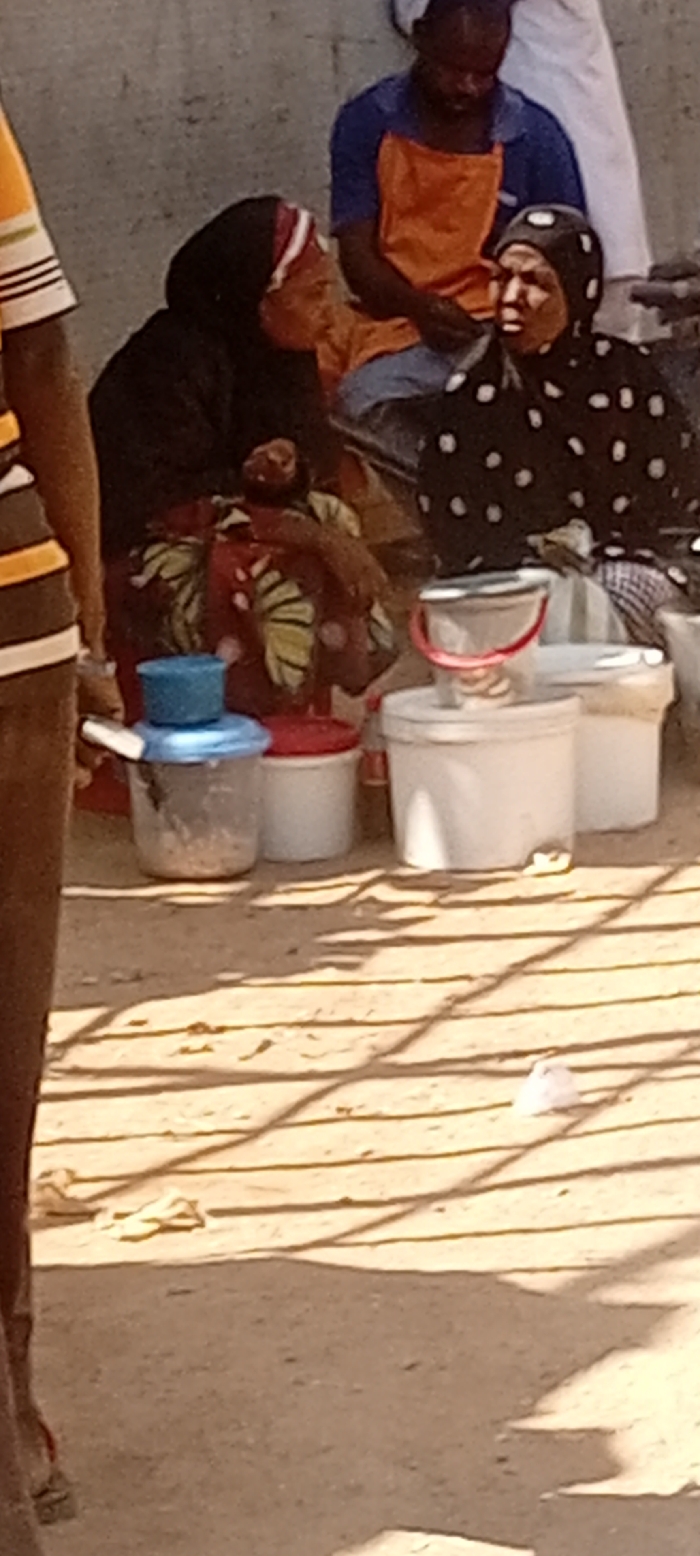 The image depicts an outdoor daytime scene in Fagge A, Nigeria, featuring multiple individuals and various containers on a dusty, light brown ground