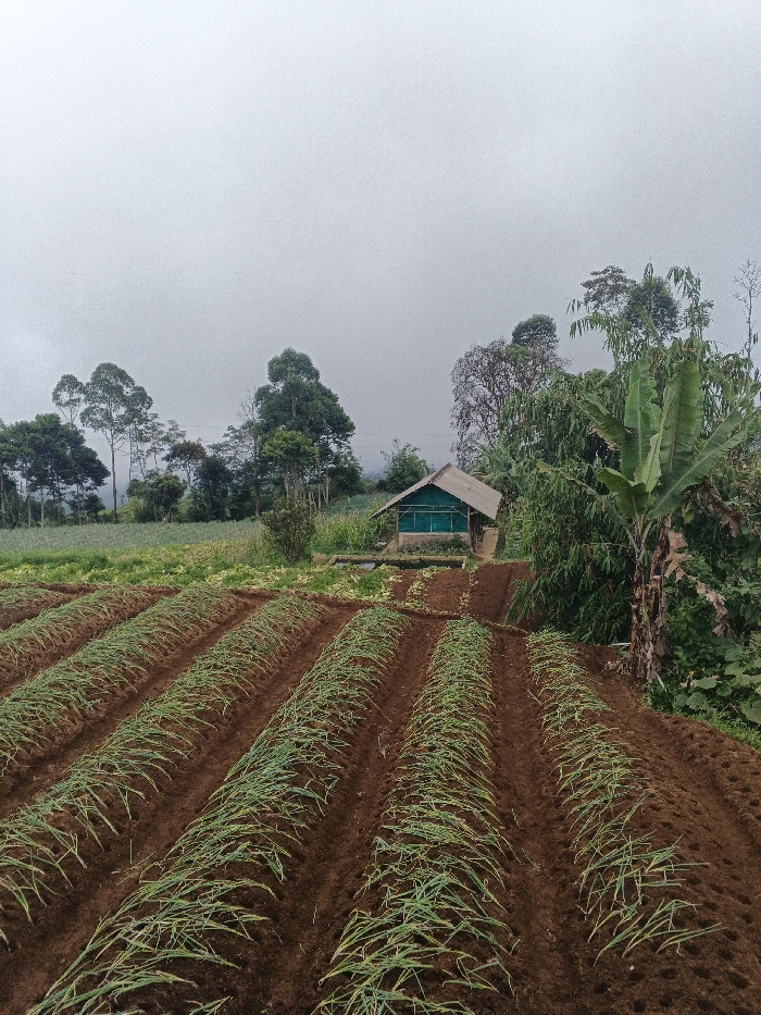 The image depicts an agricultural field under an overcast, light gray sky in the city of Banteay Srei, Cambodia. The foreground and mid-ground are dominated by parallel, evenly spaced rows of cultivated green plants, consistent with an allium crop like garlic or green onions, planted in dark brown, tilled soil. In the mid-ground, slightly right of center, a small, elevated single-story hut is visible, featuring a light-colored gable roof and teal-colored walls or shutters. Lush, diverse vegetation frames the scene, including tall, slender trees in the background, a dense cluster of various green foliage to the left of the hut, and a prominent banana tree with large leaves on the far right. No individuals or animals are present in the scene.