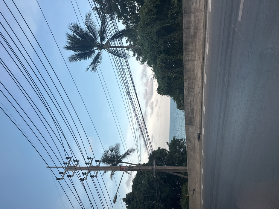 A streetscape on a sunny day features a clear blue sky with power lines running diagonally across the frame. Palm trees stand tall, one positioned near the top and another by a utility pole. Lush green foliage borders the street, leading to a glimpse of a calm ocean under a cloudy sky. The right side of the image shows a gray asphalt road with a concrete curb.