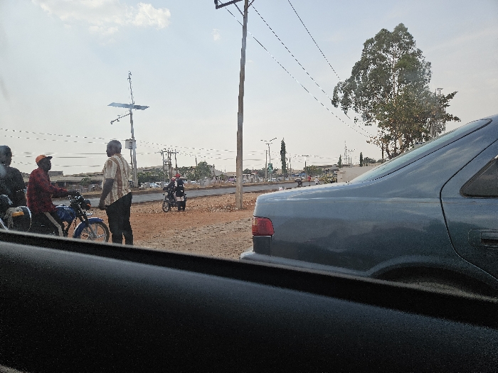 The image depicts a daytime street scene in Kakuri Gwari, Nigeria, viewed from the interior of a vehicle, evidenced by a dark, blurry horizontal foreground element. On the left, two adult males are visible on an unpaved shoulder adjacent to a paved road. One male, wearing a red shirt and orange cap, is seated on a blue motorcycle, facing right. Another male, wearing a striped shirt and dark trousers, stands next to him, facing the seated individual. Further down the road, a third individual is visible on a motorcycle, facing away. A dark blue sedan is parked or stopped on the right side of the frame, partially obscuring the background. Multiple utility poles with overhead lines extend across the scene, including one with a visible solar panel array. A large, green-leafed tree stands on the right, behind the sedan. In the background, a paved road extends into the distance, lined with streetlights and distant buildings under a clear, pale blue sky with minimal cloud cover.