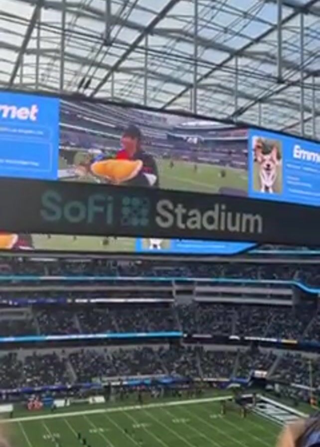 football game at SoFi Stadium in Los Angeles, CA. The massive video screen displays highlights and promotional material. The stands are filled with fans, and the football field is visible below.