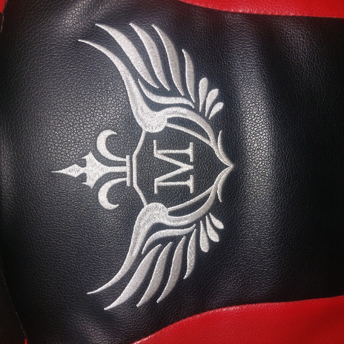 A close-up image depicts a black textured surface, characteristic of synthetic leather or vinyl, adorned with a centrally located embroidered emblem. The emblem, rendered in silver-gray thread, consists of a shield containing a capital 'M', flanked by symmetrical stylized wings, and surmounted by a fleur-de-lis or crown-like element. The black material exhibits a fine pebble-grain texture. A smooth, curved section of red material is visible along the left margin of the frame, indicating a two-tone design with a seam. No individuals, actions, or specific environmental context are discernible beyond the object itself. The object is located within the city of Gimpo, South Korea.
