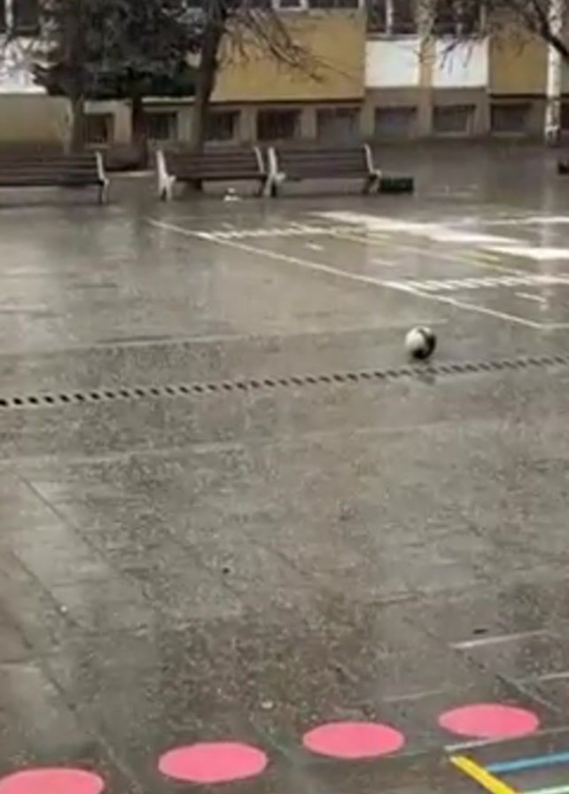 The scene shows a school playground in the rain. A soccer ball is lying on the wet concrete surface of the playground, with rain falling heavily. In the background, there's a yellow building with many windows and bare trees. Several benches are arranged along the building. The playground has colorful markings like circles and a geometric design. There is audible shouting in the background.