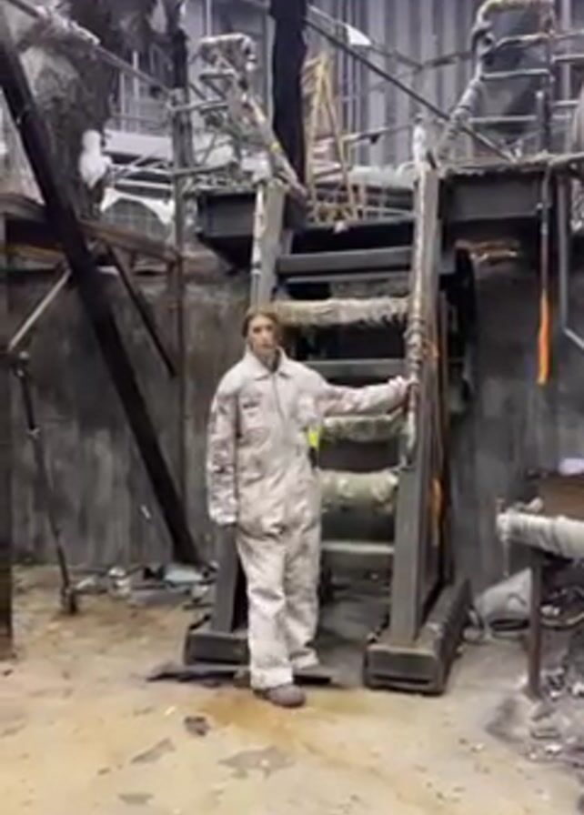 person standing in front of a staircase in what appears to be an industrial or derelict setting