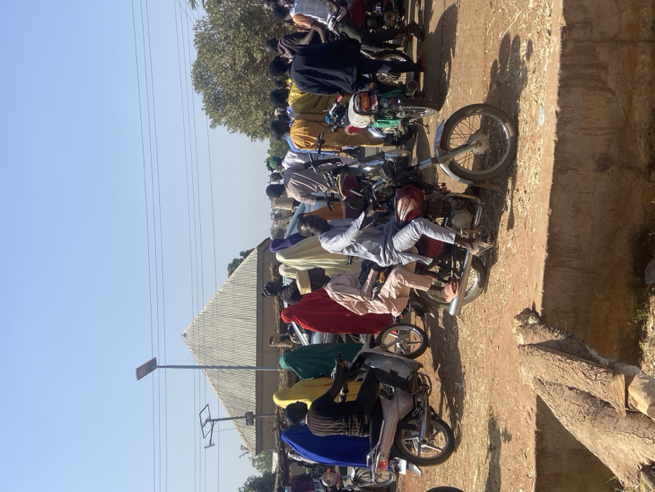 This image depicts an outdoor gathering in Konkiyel, Nigeria, under a clear, bright blue sky with strong sunlight casting distinct shadows