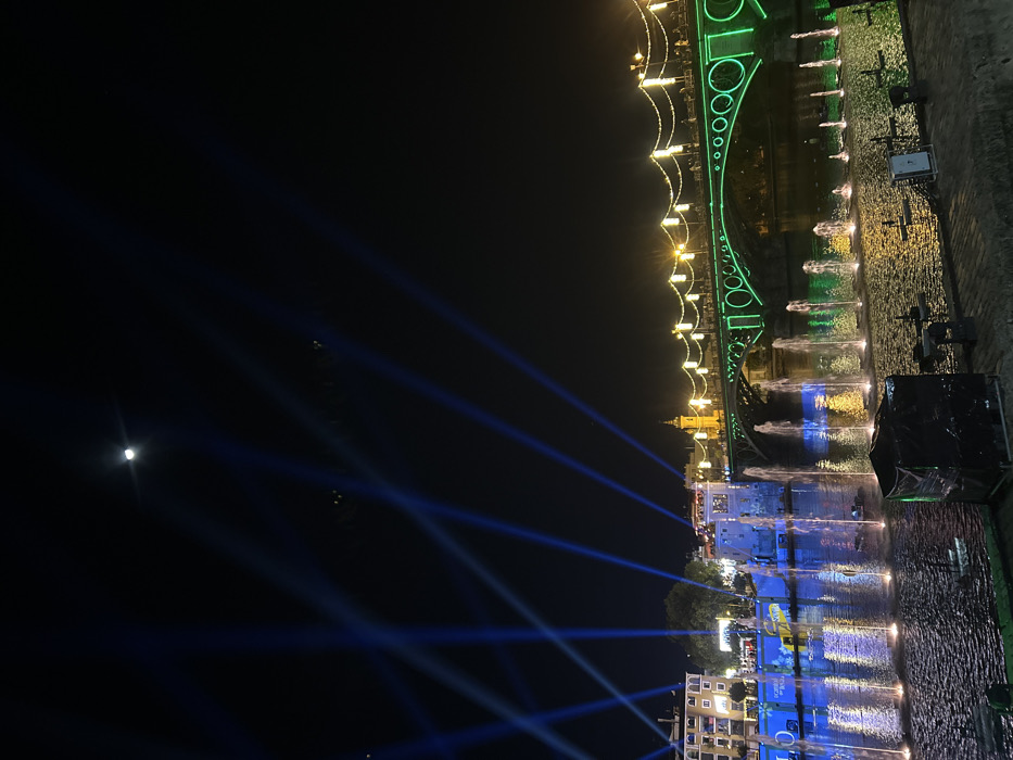 At night, a river reflects illuminated buildings and blue spotlights. A green bridge with yellow lights arcs across the water, where fountains shoot up. A dark sky is visible, marked by a distant moon. A black rectangular object sits on the riverbank.