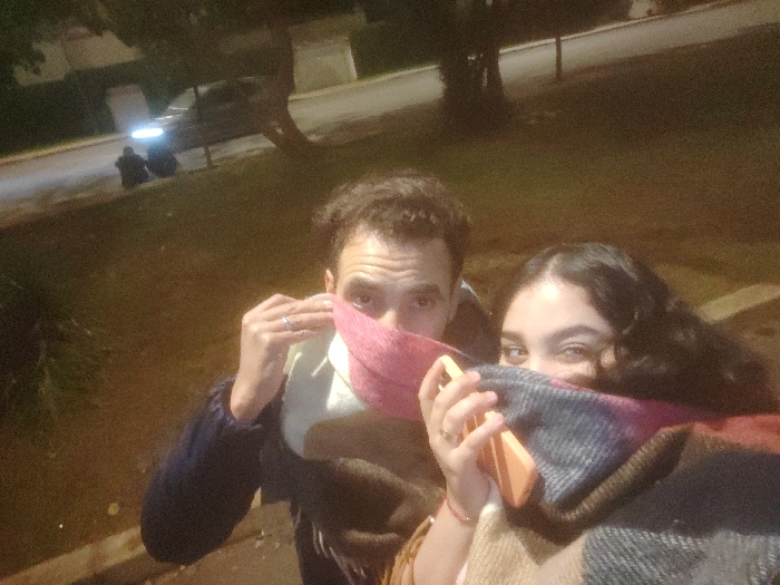 A man and a woman stand close, partially obscuring their faces with a multi-colored scarf. The man, on the left, pulls the scarf towards his face with his left hand. His eyes and part of his nose are visible. The woman, on the right, holds a cell phone with her left hand, using the screen to prop the scarf against her face; only her eyes are showing. They are outside at night, a road and parked vehicles in the background. The lighting is dim.