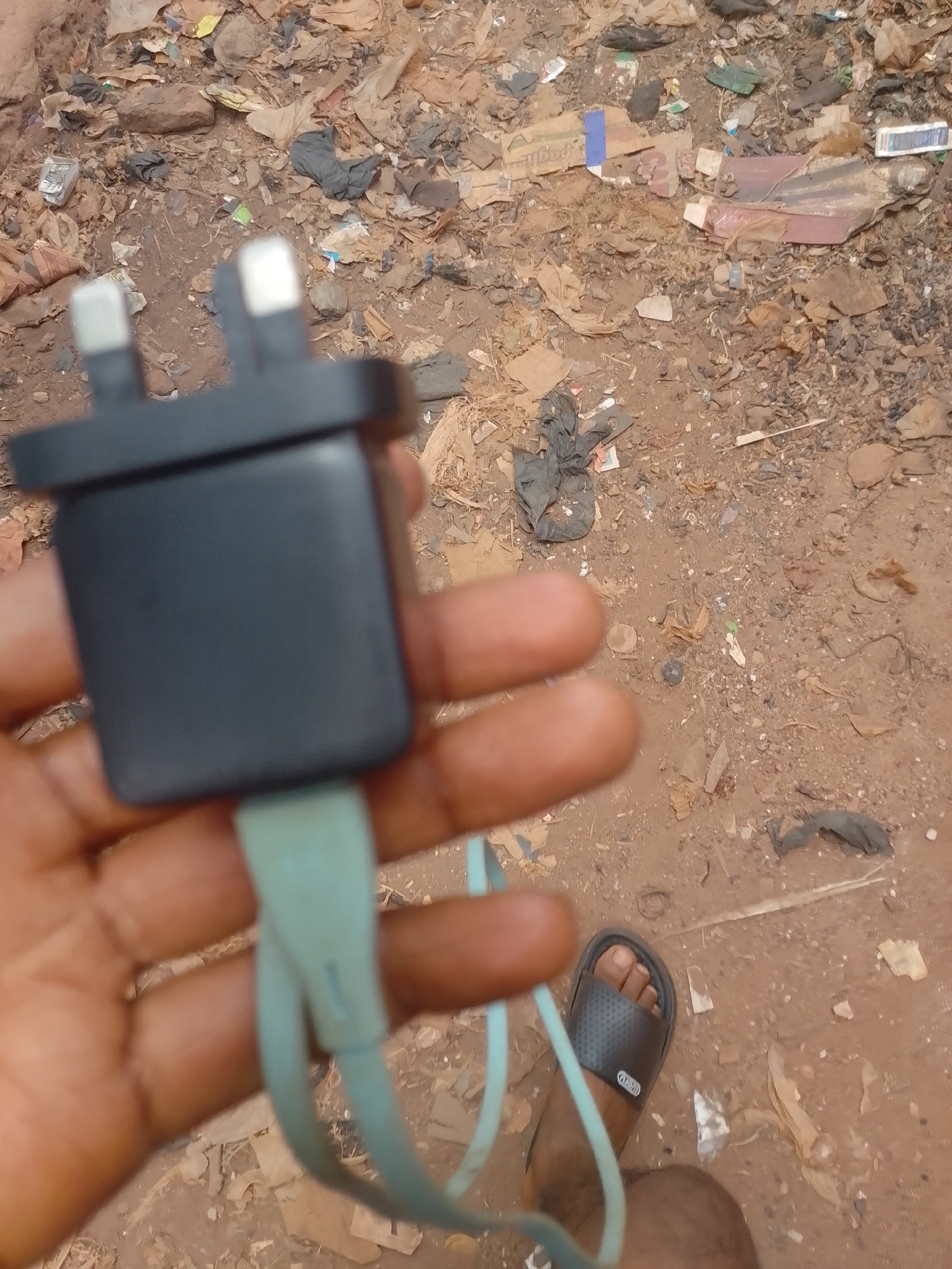 person holding a black UK plug with a light blue cable attached. The background is a littered area with dirt, plastic, and other waste. The person is wearing a black sandal on their foot. The location appears to be a discarded area.