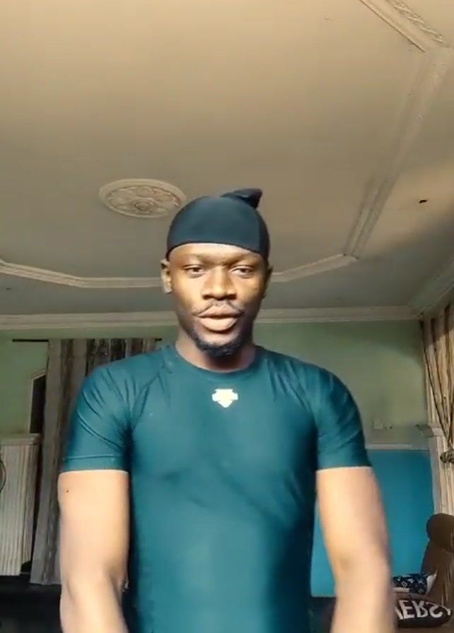 A man is standing indoors, wearing a close-fitting, short-sleeved teal shirt with a small white logo on the chest and a black durag on his head. He is facing the camera, and the camera angle is slightly upward. He smiles and flexes his arms, pointing to his right bicep with his left hand. The background shows a room with beige walls, an ornate white ceiling, and curtains partially obscuring a window. Other items in the room include a heater and some furniture. The lighting is somewhat dim.