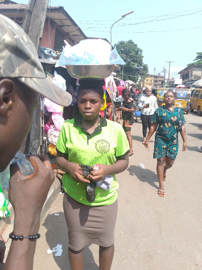 The image depicts a street scene in Onitsha, Nigeria, characterized by commercial activity and pedestrian traffic under clear skies. In the immediate foreground on the left, the partial view of a person shows a camouflage cap and a right hand holding a clear plastic bag containing a white object. A black beaded bracelet is visible on the wrist. Centered in the mid-ground stands a young Black woman facing slightly left of the camera. She wears a lime green short-sleeved polo shirt with a black collar and a visible crest on the left chest, appearing to be "LAGOS STATE POLYTECHNIC." She wears a fitted brown skirt. A silver metal basin containing white, bagged items covered by a light blue plastic sheet is balanced on her head. Her hands are clasped at waist level, holding two black plastic bags and a small piece of light grey fabric. Her facial expression is neutral. Behind her, on a paved street, several individuals are visible. A Black woman walks towards the right in a patterned green and blue short-sleeved dress, carrying a black handbag, and wearing brown sandals. Further back, another Black woman in a white patterned shirt holds a mobile phone. Other individuals are present near stalls or shops lining the left side of the street, where various items, possibly plush toys or garments, are displayed for sale. Vehicles are present in the background, including a yellow auto-rickshaw (Keke Napep) with a blue star logo on its rear and parts of other yellow vehicles. Buildings in the background appear to be multi-story and urban. A street light pole is visible on the right. The ground is light-colored asphalt or concrete with some scattered debris. Green foliage from trees is visible in the distance under a bright, clear sky.
