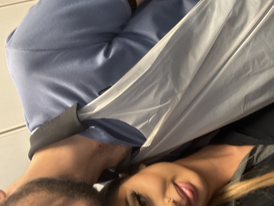 The image captures two individuals in close proximity within an indoor setting in Erstein, France. The left portion of the frame features the right side of a female's face, displaying a dark eyeliner, a small gold hoop nose piercing, and lips with dark lipstick. Her light-colored hair is visible along her right shoulder. She wears a dark garment. Behind her and to the right, a male individual is partially visible, showing his bearded lower face and neck close to the female's head. He is dressed in a light blue, possibly synthetic, long-sleeved garment. A light grey, translucent plastic material or bag with a black strap traverses diagonally across the center, partially obscuring both individuals. The background consists of blurred, light-colored vertical surfaces, indicative of an interior wall.