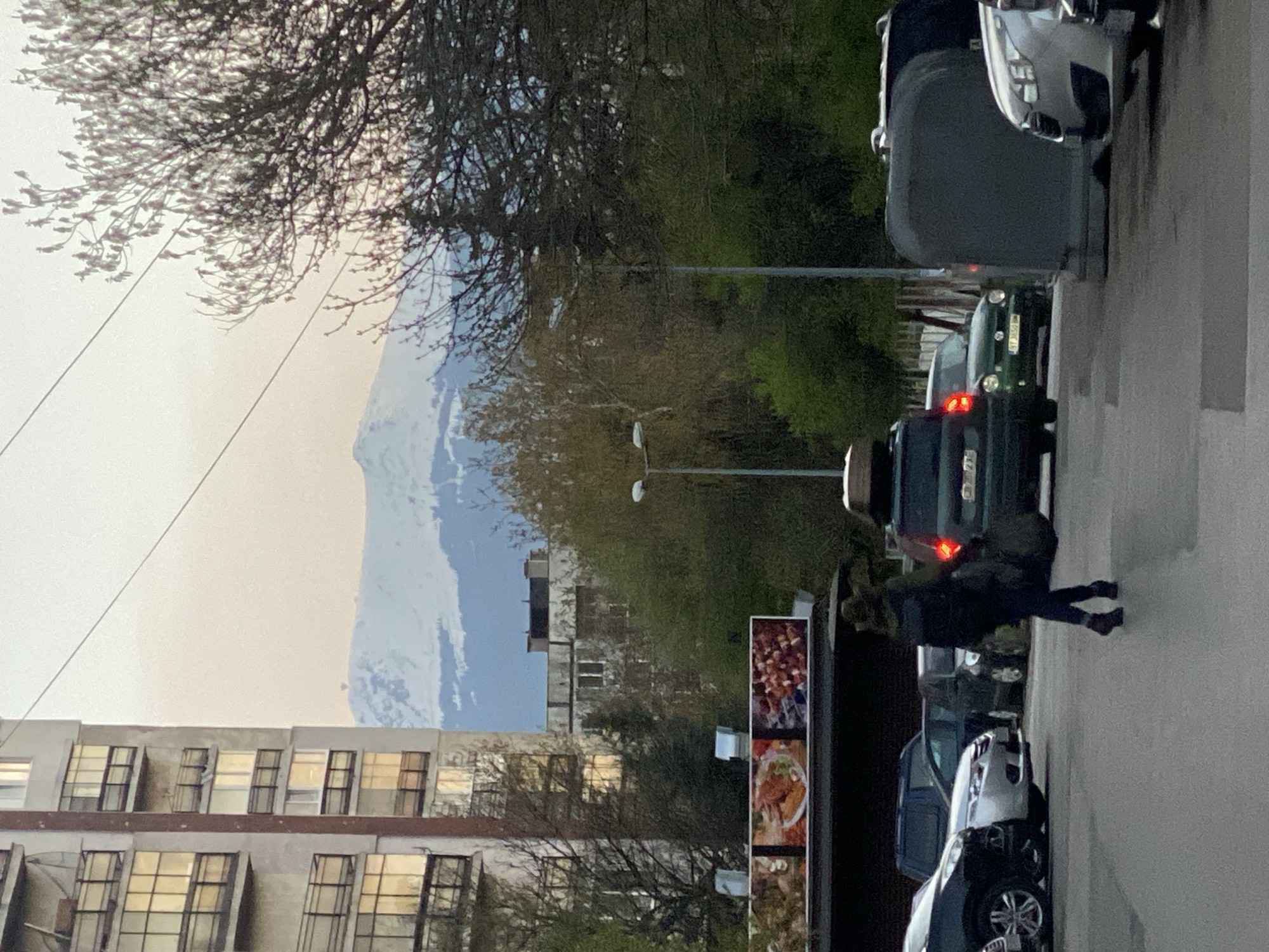 n urban street scene in Sofia, Bulgaria. A multi-story apartment building with numerous windows is visible on the left side. The mountain peak is slightly visible in the background. A tree with bare branches partially obscures the sky and the mountain. On the right side of the street, there are several parked cars and a person walking. A vertical sign with food advertisements is also present. The street is paved.