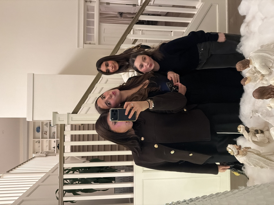 A reflection shows four women near a staircase. The first woman holds a phone, taking a selfie, dressed in a dark jacket. Two women stand behind her, one in a black sweater and jeans, the other in a blue top and black skirt. The fourth woman is further back and looks at the camera. A Christmas scene with angel figurines and fake snow is also reflected. The staircase has white railings and is adorned with greenery. A built-in bookshelf is visible in the background.