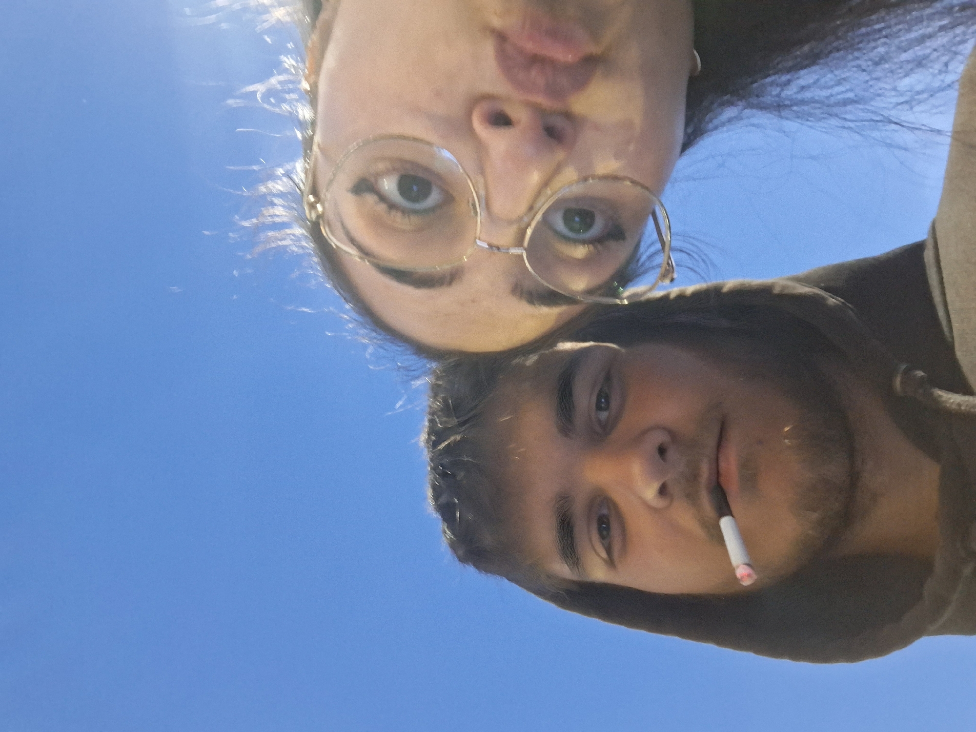 Two individuals are captured from a low-angle perspective against a bright blue sky. The upper individual is a fair-skinned person with dark hair and glasses, pursing their lips. The lower individual has dark hair and is wearing a hoodie. A cigarette is held in their mouth. The location is an unidentified city.