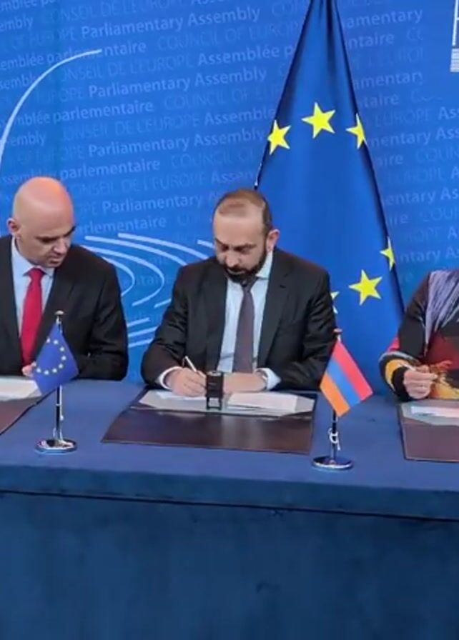 Three individuals, two men and one woman, are seated at a table signing documents. The man on the left wears a black suit and a red tie. The man in the center wears a black suit and a patterned tie. The woman on the right is wearing a colorful patterned top. The table is covered with a blue cloth, and each individual has a small flag in front of them, representing the EU and Armenia. They are signing documents on individual pads. The background features a blue wall with the words "Parliamentary Assembly" in both English and French, and a large European Union flag. To the left, a glass display case houses an open, old book. A person holds up a smartphone to record the event. The screen of the phone shows a recording of the same event.