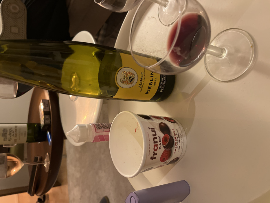The image displays a table scene featuring a bottle of Alsace Riesling 2024 alongside a half-empty glass of red wine. Next to them is a cup of Franuí Dark chocolate covered raspberries and a vaping device bottle. In the background, another wine bottle is partially visible. Plates and table are also included in the image. The composition is taken at a tilted angle.