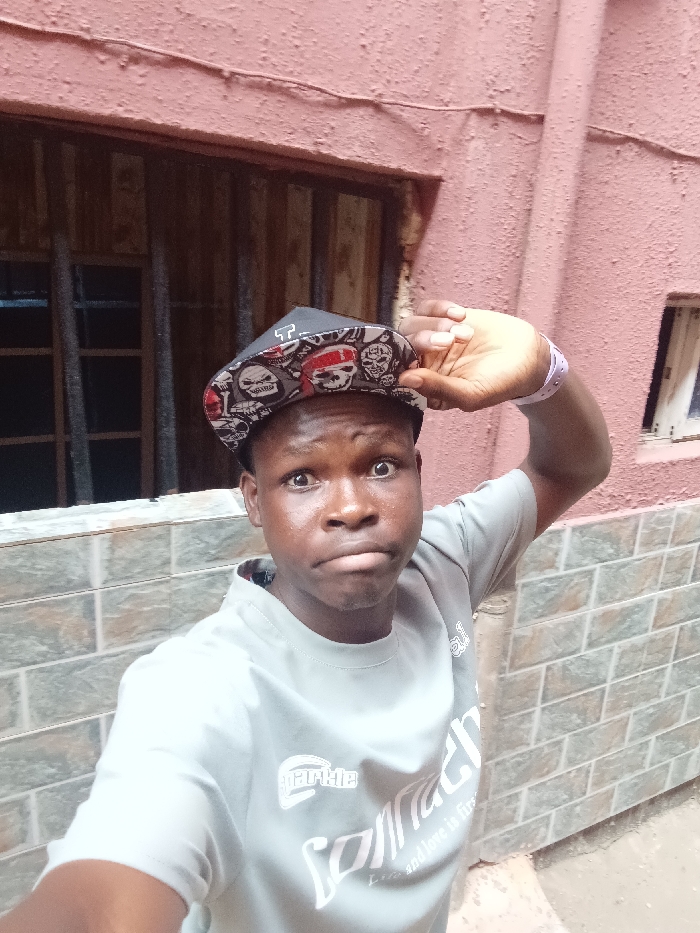 A young man poses for a selfie outdoors. He wears a gray T-shirt with a logo, a skull-patterned cap, and a white wristband. He holds the cap with his hand. The background consists of a red-painted building with window grates and a wall with a brick-like pattern. The lighting appears to be daylight.