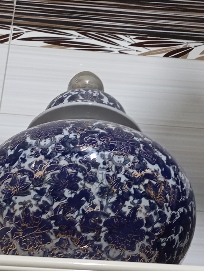 - "An upright, white and dark blue ceramic jar with a multi-tiered lid and a clear, spherical finial is positioned centrally in the foreground" by FM-qjUs52, licensed under CC BY 4.0