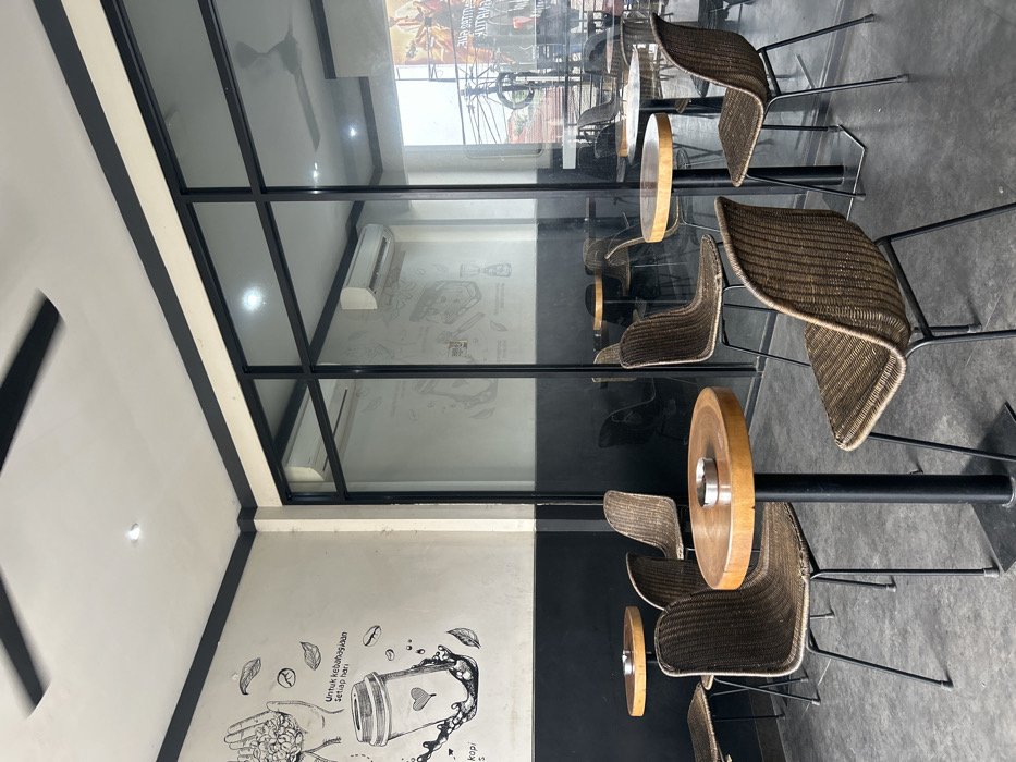 This image depicts the unoccupied interior of a coffee shop or cafe located in Bekasi, Indonesia