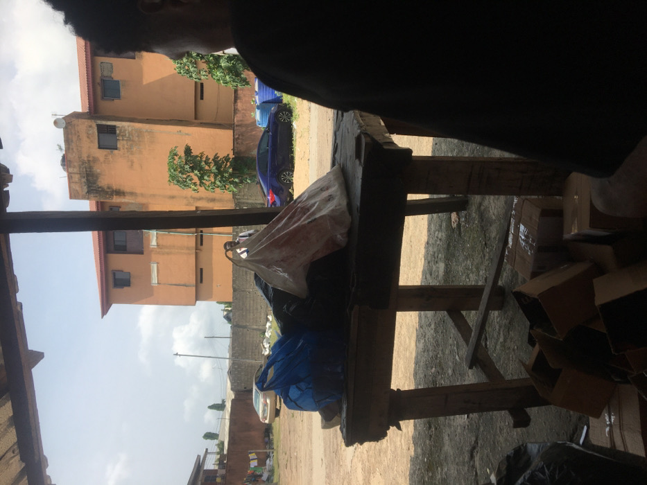 The scene depicts an outdoor or semi-outdoor area in Awjaw, Nigeria, under a wooden shelter, viewing an unpaved open space and residential structures under a partially cloudy sky. In the immediate foreground, to the right, the back and right shoulder of an individual wearing a dark garment are visible, facing left. Central to the foreground is a weathered wooden table laden with multiple plastic bags: one blue, one black, and one white with red markings. Beneath the table, a pile of brown cardboard boxes rests on the ground. Beyond the immediate foreground, an unpaved dirt path or open lot is visible. On the left side of this path, a light-colored sedan is parked near a low concrete block wall, behind which clothes hang on a line. Towards the right, a dark blue sedan is parked. Between the two vehicles, a male figure in a light shirt and dark trousers stands facing generally right. The background is dominated by a large, multi-story building with an orange-ochre facade and a reddish-brown roof, featuring multiple windows. The building shows signs of weathering and discoloration. A satellite dish is visible on its roof. Trees with green foliage are present near the building. Overhead, parts of the wooden beam and slat structure of the shelter are visible, indicating the vantage point.