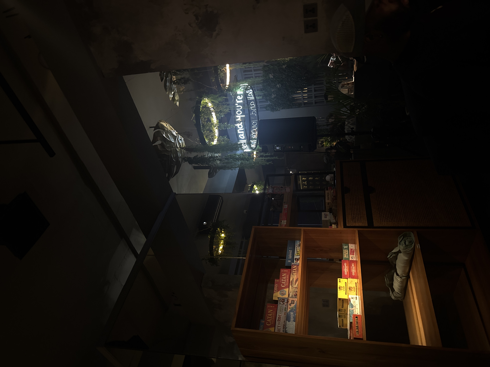 The photograph depicts a dimly lit interior space in North Kuta, Indonesia, featuring a partially obscured view of an exterior patio. Dominating the right side of the frame is a wooden shelving unit filled with board games, including multiple editions of "Catan," "Ticket to Ride Europe," "Secret Hitler," and "Codenames." A rolled-up textile object is also present on one of the shelves. Through a large, window-like opening, a glimpse of the patio is visible. The phrase "Well and you're" is spelled out in glowing lights, possibly a sign or decorative element. Green vegetation surrounds the sign and structures on the patio.