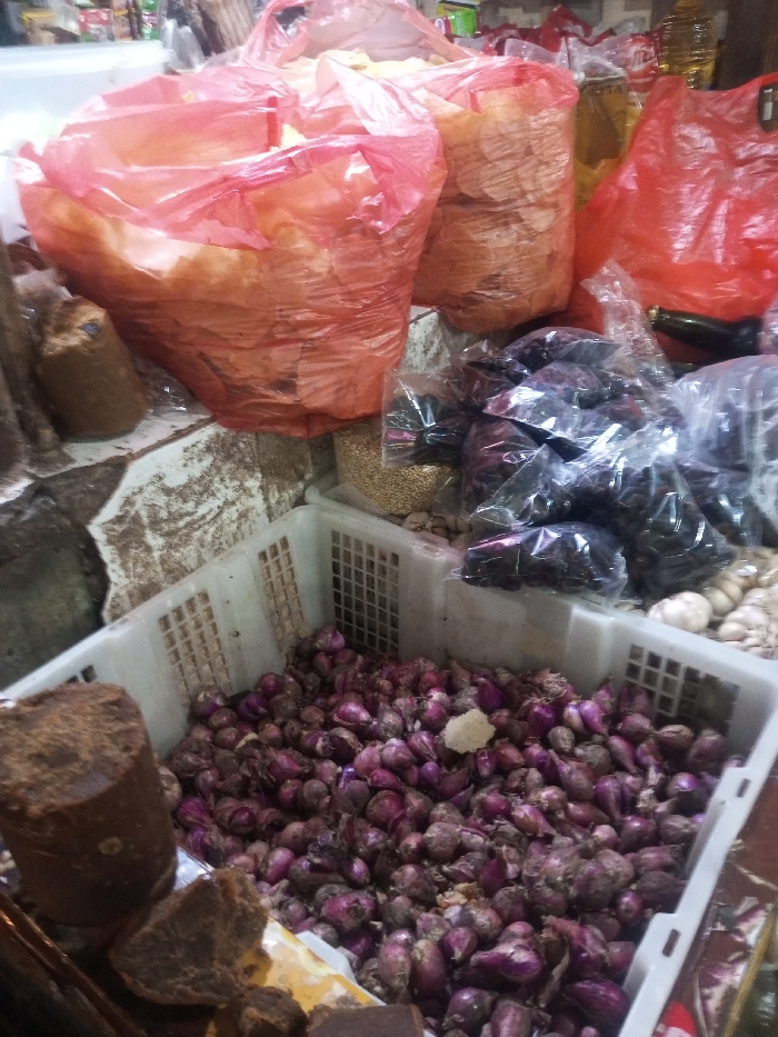 A low-angle shot displays a variety of food items in a market setting. In the foreground, a white plastic crate is filled with red onions. Large brown blocks are beside the crate. In the background, translucent red plastic bags hold assorted goods. Small black bags containing dates and garlic bulbs are visible between the red bags and the crate. A bottle of oil is seen amongst the goods. A tiled surface is visible behind the food.