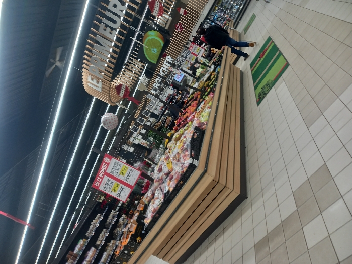 A brightly lit supermarket aisle is angled diagonally across the frame. A wooden fruit and vegetable display features produce and price signs labeled "Gala" and "France." Above the display, a large sign reads "Le Meilleur Fraicheur." A person is walking along the aisle. The floor is tiled in a pattern of light and dark squares. A green mat with stripes and an image sits on the floor. Above, rows of bright lights illuminate the scene.