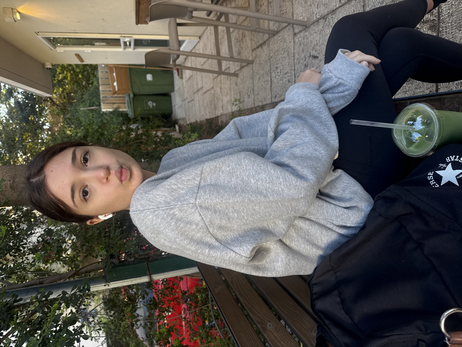 A young woman with dark hair and light skin sits on a bench, wearing a gray sweatshirt and black leggings