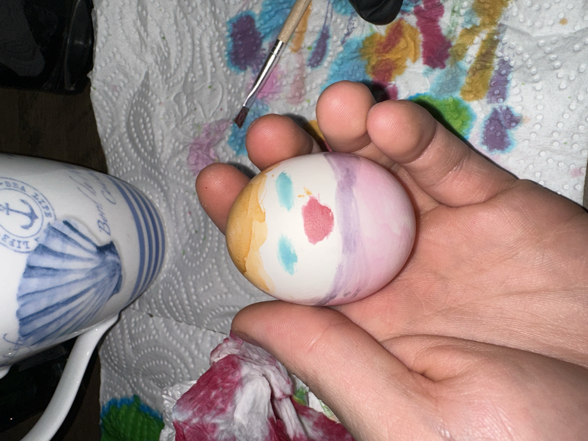 A person is holding a decorated egg in their hand. The egg has various watercolor-like patches of color including yellow, light pink, purple, red, and blue. A paint brush lies on a paper towel behind the egg and hand, and there are various blobs of watercolor paint on the paper towel as well. Part of a mug with blue stripes and a blue anchor emblem is visible on the left. The exact location is not discernible from the image.