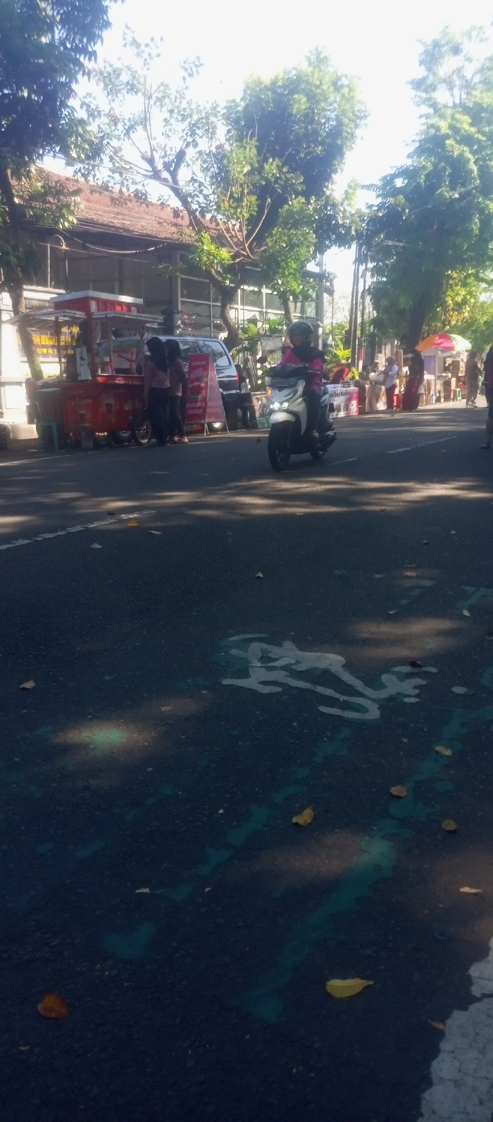The image captures a daytime street scene in Nganjuk, Indonesia. The foreground displays a dark asphalt road with scattered dry brown leaves, faded light blue painted markings, and irregular white liquid stains. Patches of sunlight and shadows from overhead trees are visible on the road surface. In the midground, a light-colored scooter, predominantly white or light grey, is in motion, oriented towards the left side of the frame. The rider, an individual wearing a pink or magenta long-sleeved top, a dark helmet, and a dark head covering (likely a hijab), operates the scooter. The background features a bustling roadside environment. On the left, a red street vendor cart with a red and white striped awning is positioned on the pavement. Several individuals are present near this cart, including two women wearing dark tops and dark head coverings, appearing to be interacting. Behind the vendor setup, a dark-colored van or SUV is parked, and an A-frame sign displaying red text, including "SUZUKI" and "FUSUMA AUTO GROUP NGANJUK," is visible. Structural elements of a building, including windows and a dark tiled roof, are partially visible behind the vehicles and vendor stalls. Further to the right in the background, additional market stalls with vibrant, colorful umbrellas (red, green, yellow) are present, surrounded by various pedestrians. The entire scene is framed by numerous trees with dense green foliage, casting significant shadows. The sky above is bright and clear.