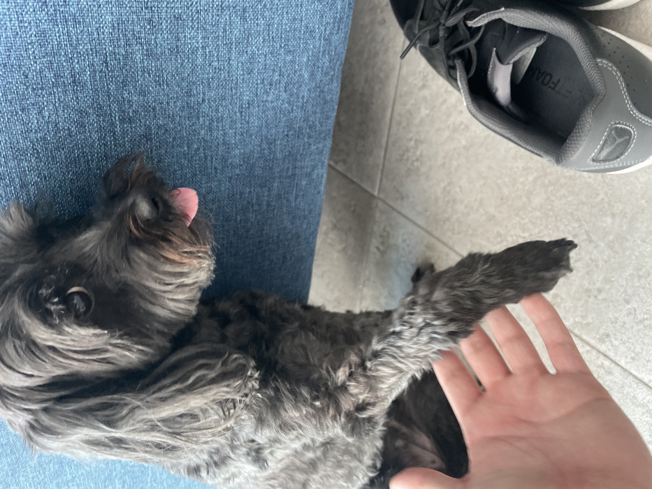 A gray-haired dog with its tongue sticking out lies on a blue denim surface. A human hand reaches for one of its paws. The dog's fur is shaggy, and its eyes are partially visible. A pair of sneakers, gray and black, rest on a tiled floor to the right of the dog. The scene is captured from a top-down perspective in natural lighting.
