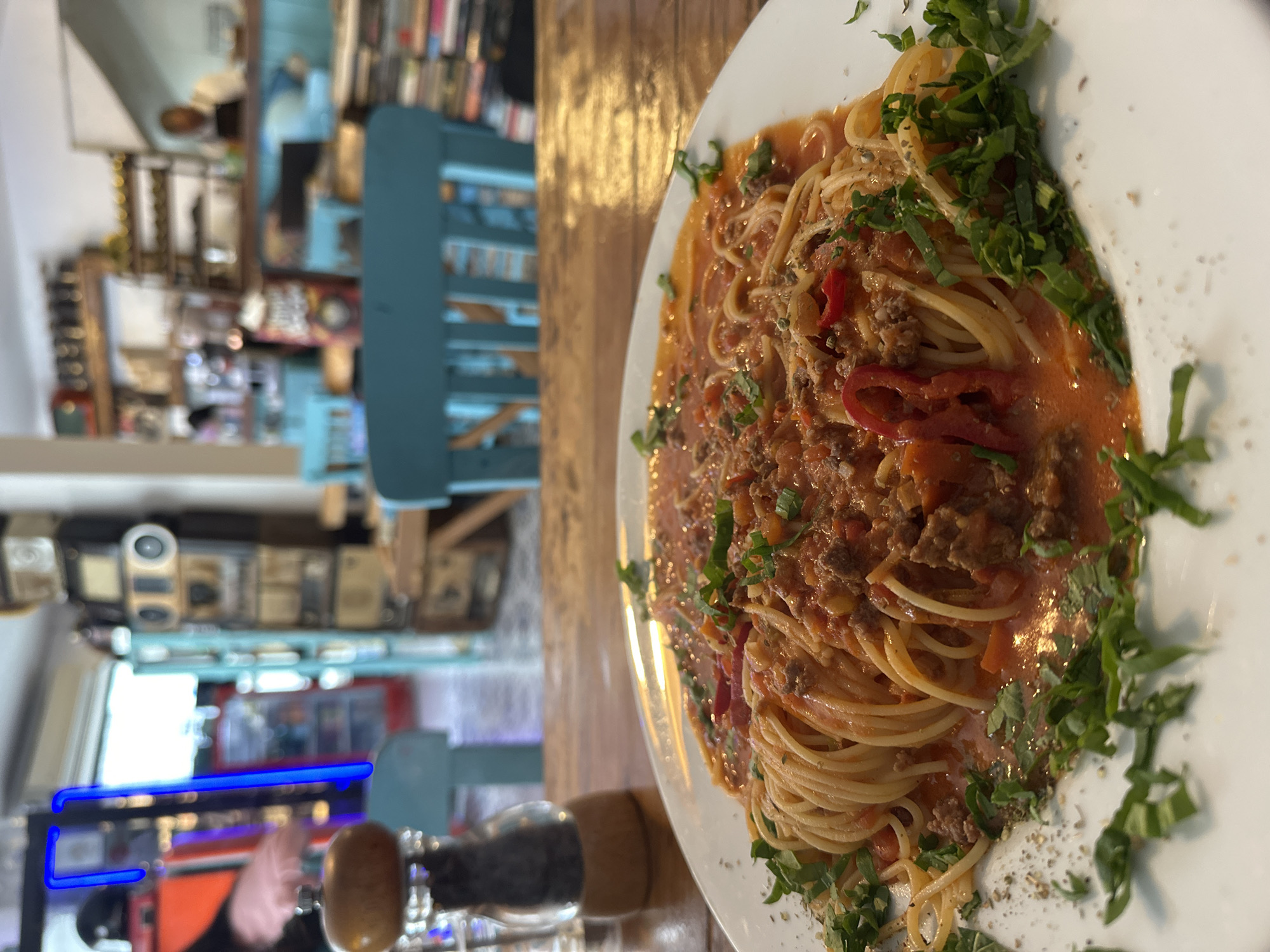 A plate of spaghetti with meat sauce and basil is on a wooden table. In the background, out of focus, is a turquoise chair and shelves with books and various objects. The scene is possibly a restaurant in Bodrum, Turkey.