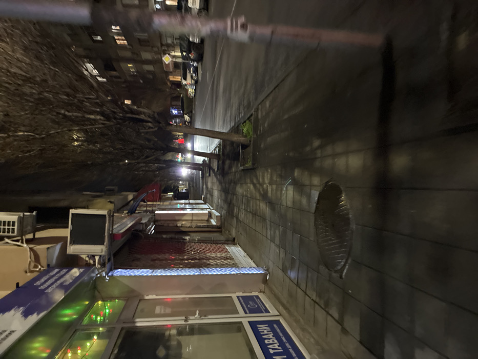 The image depicts a nighttime urban street scene at bul. „Георги С. Раковски“ 7, Burgas Center, 8000 Burgas, Bulgaria, specifically looking east along the sidewalk. The foreground on the left shows a wet, tiled sidewalk with a circular metal manhole cover. Adjacent to the sidewalk is a two-story building facade. The leftmost storefront features large glass windows and a glass door, behind which red and green decorative string lights are visible. Blue signage with white Cyrillic text, reading "СПЕЦИАЛНИ ТАВАНИ" (Special Ceilings) and "РЕМОНТИ ЗА ВАШИЯ ДОМ, ОФИС ИЛИ МАГАЗИН" (Repairs for your home, office or shop), is affixed to the building. A vertical strip of blue LED lighting runs along the side of this storefront. To its right, another shopfront is secured by a red metal roll-down security shutter. Above this shutter, two air conditioning units and a square, dark outdoor display unit are mounted on the building facade. The midground features a row of five bare deciduous trees planted in square tree pits along the edge of the sidewalk. Parallel to the sidewalk is an asphalt road, appearing wet and reflecting light sources. Headlights from multiple vehicles are visible in the distance, indicating traffic. In the background, on the right side of the road, several cars are parked. A multi-story building with illuminated windows lines the street, and a yellow diamond-shaped road sign is discernible in the distance. The far right edge of the frame shows a blurred vertical object, possibly a pole. No individuals are present in the scene.