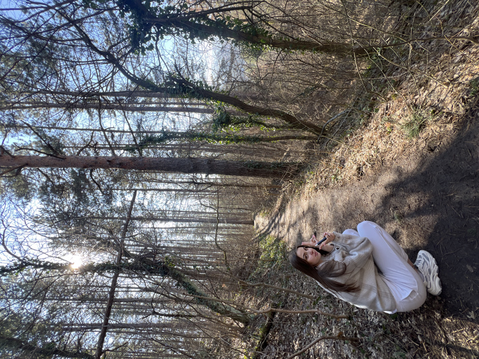 A single female subject is depicted squatting on a dirt path within a dense forest in German, Bulgaria. She has long, dark brown hair and is wearing a light-colored, possibly beige, knitted sweater, white athletic pants, and white and grey chunky-soled sneakers. Her right hand is raised, forming a two-finger 'V' gesture, while her left hand holds a dark, cylindrical object, consistent with a vape pen, close to her chest. She is looking directly at the camera. The path, covered in dry leaves and soil, recedes into the background under a bright, sunny sky. Numerous tall trees, a mix of conifers and bare deciduous trees, line the path. Sunlight filters through the tree canopy from the upper left, casting distinct shadows on the path. Several tree trunks on the right side of the frame are covered in green ivy. Through the trees on the right, a bright, distant view, possibly of a valley or open terrain, is visible. The ground is largely covered with dry foliage, consistent with late winter or early spring conditions.