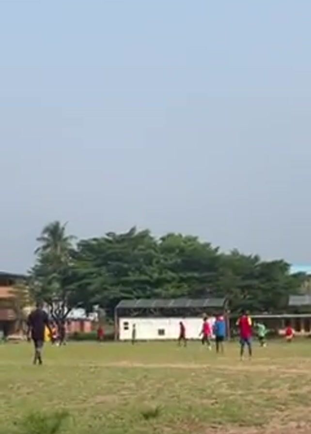 group of people playing soccer on a grassy field in front of a three-story building. The building is painted in orange and yellow hues, with a blue roof. There are several trees in the background. The people playing soccer are wearing various colored shirts, including red, green, and black. The sky is light blue, and the overall atmosphere appears hazy. The camera pans to follow the action on the field.