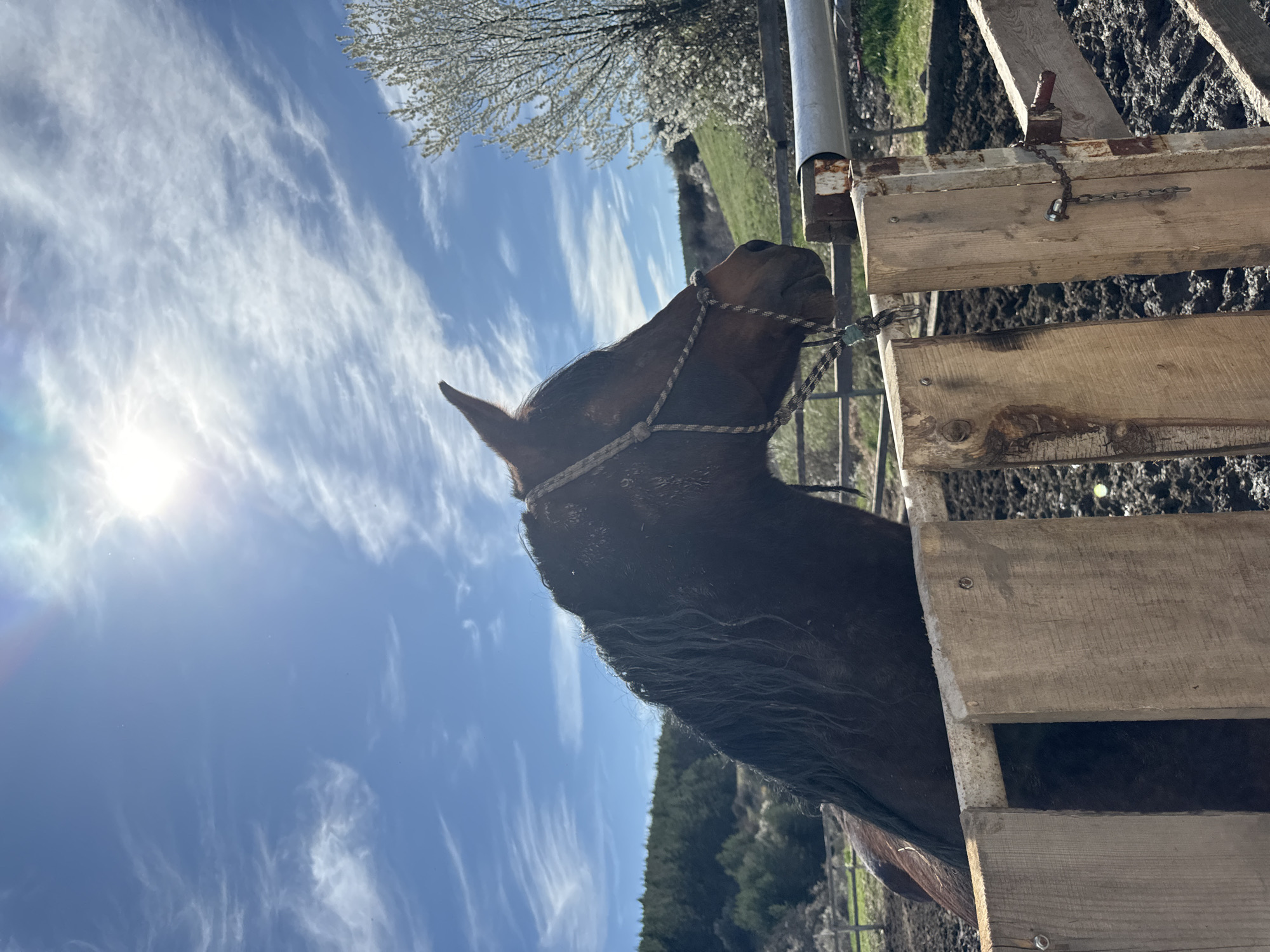 A brown horse is standing by a wooden structure with a metal frame, possibly a pen or feeder. The horse is wearing a rope halter. Behind the horse, there is a field, trees, and a bright blue sky with wispy clouds. The sun is shining brightly in the upper left corner of the image. The image is slightly rotated counterclockwise. The location is not evident in the image.