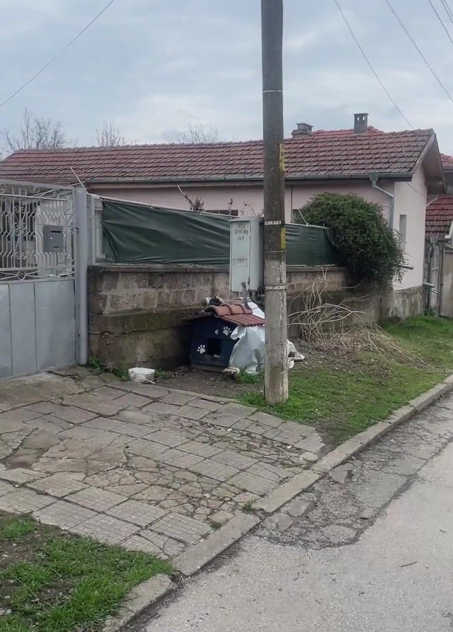 The video depicts a street in a residential area under a cloudy sky. The road is asphalt, and sidewalks are visible on the sides. Houses line the street, most with tiled roofs. A yellow garbage container sits on the side of the road. In the first part of the video, barking sounds are heard.