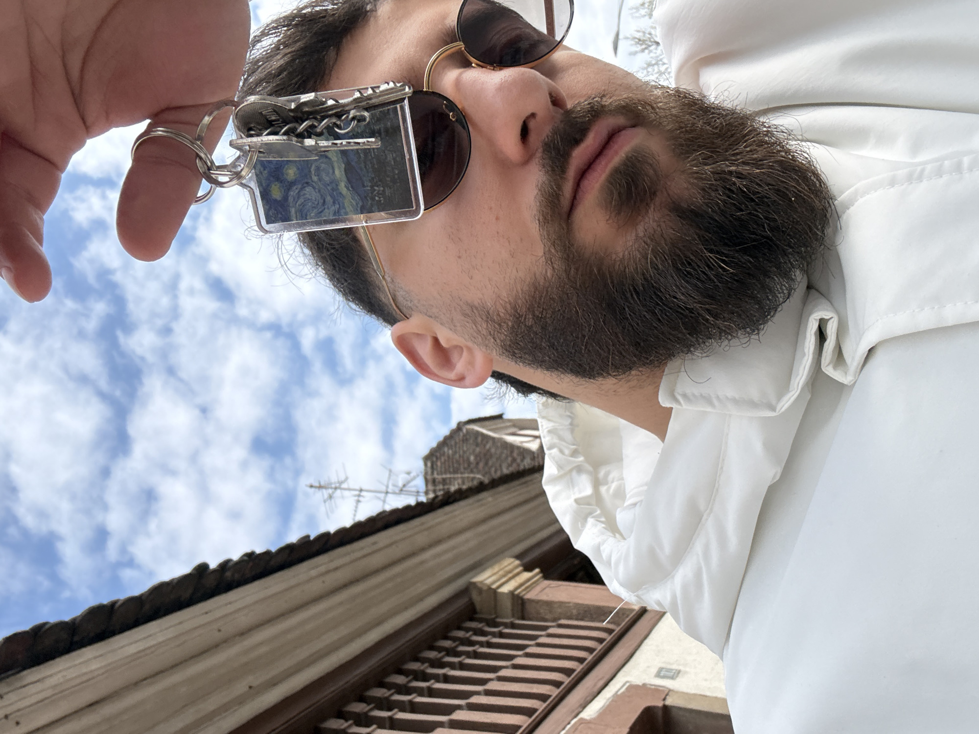 An outdoor, low-angle image depicts a male subject in Lingolsheim, France, under a partly cloudy sky with white clouds. The subject features dark hair, a full dark brown beard, and a mustache. He wears dark-lensed sunglasses with thin gold-colored frames and a white hooded jacket. A hand extends from the upper right of the frame, holding a set of keys suspended directly above the subject's head. The keys are attached to a clear rectangular keychain displaying an image resembling Vincent van Gogh's "The Starry Night," along with multiple silver-colored keys on two separate rings. The subject's gaze is directed forward and slightly downward. In the background, a traditional building structure is visible, featuring reddish-brown roof tiles, timber framing with vertical balusters, and a light-colored wall section with a square plate marked "11." A metallic television antenna is discernible against the sky further in the background.