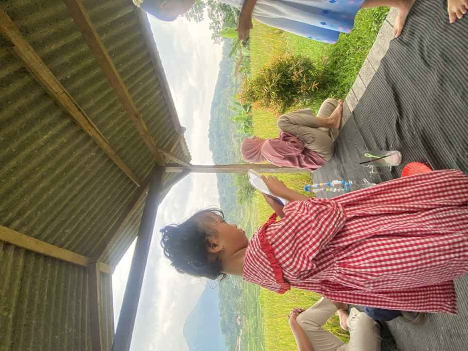 The scene depicts four individuals within an open-sided shelter with a corrugated metal roof and wooden supports, located in Selotapak, Indonesia. The shelter's floor is covered with a dark, horizontally-striped mat, overlooking a landscape of terraced rice paddies, forested hills, and a distant mountain peak under an overcast sky. In the foreground, a young girl with dark hair, wearing a red and white checkered dress with a ruffled collar, is observed holding and looking at a white electronic device. To her right, a person wearing a pink long-sleeved top, light brown pants, and a pink hijab is seated on the mat, facing right. Partially visible on the far right, a second child stands in a blue and white dress and holds a green leaf-like object. On the far left, the lower body of a fourth seated individual, dressed in light-colored pants, is visible. Objects on the mat include a small red circular plate, two clear glasses containing pink liquid and green straws (one mostly full, one partially empty), and two small plastic water bottles adorned with colorful beads. A small bushy plant with green and yellow foliage is visible immediately outside the shelter, contrasting with the vibrant green of the rice paddies.